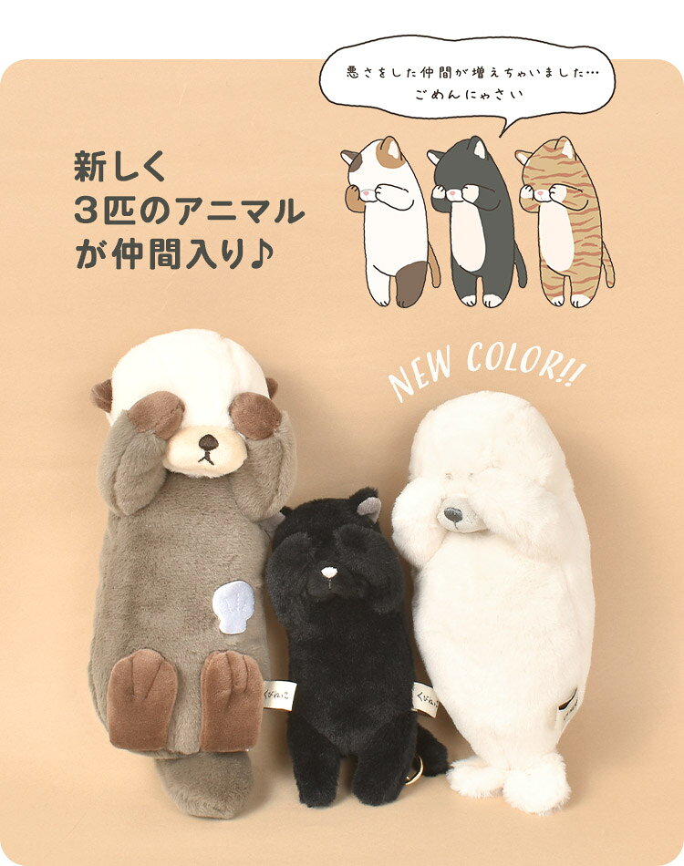 見るたびに癒されること間違いなし! spec ■サイズ:約w8×d7×h20cm ■素材: 側地/ポリエステル100% 中材/ポリエステル100% ■重量:約69g ■生産国:中国 attention ※こちらの商品は、大量生産&一部手縫いで作られているため縫製があまい部分がございます。