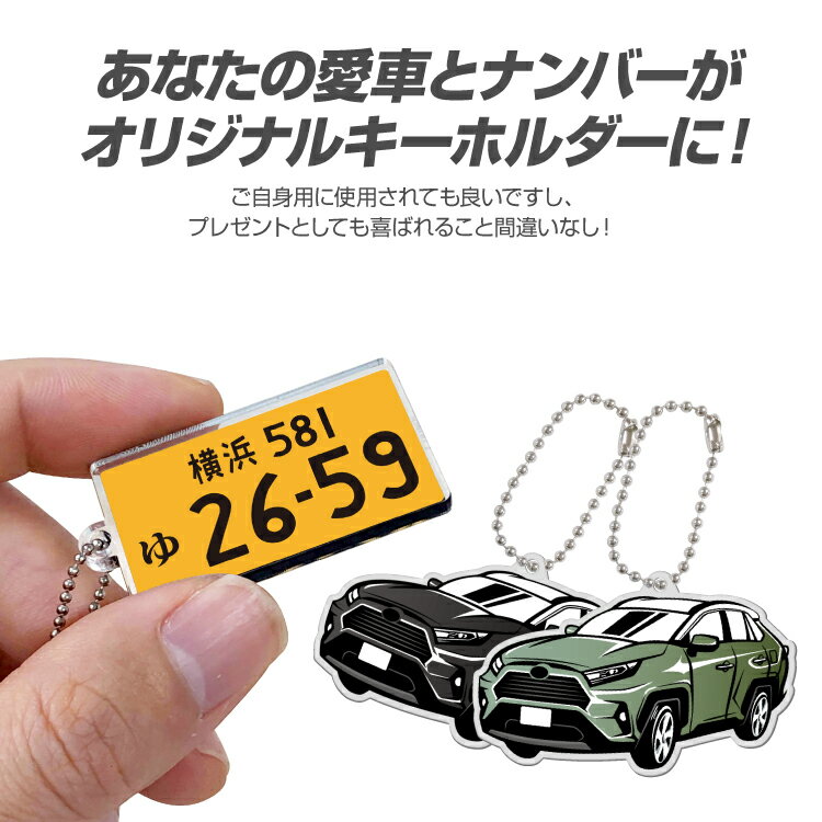 【商品名】 オリジナルナンバープレート キーホルダー+トヨタ RAV4 デフォルメキーホルダーセット 【商品詳細】 愛車のナンバーがオリジナルのキーホルダーに! 愛車のナンバープレートを超リアルに再現! ナンバープレートの地名漢字・ひらがな・数字・ハイフンまで、一文字一文字を再現・製作。