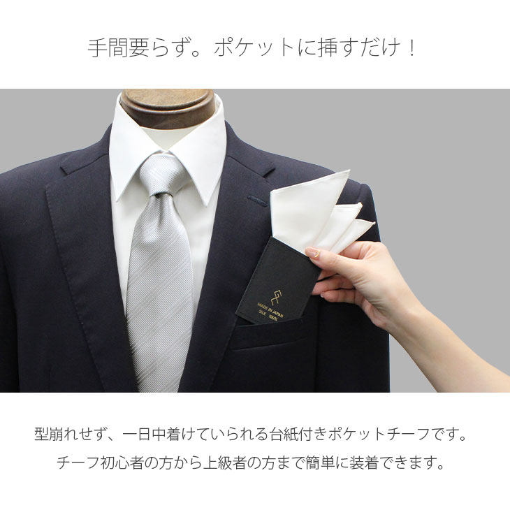1秒装着×1DAYキープポケットに挿すだけの簡単ポケットチーフ 型崩れせず、一日中着けていられる台紙付きポケットチーフです。