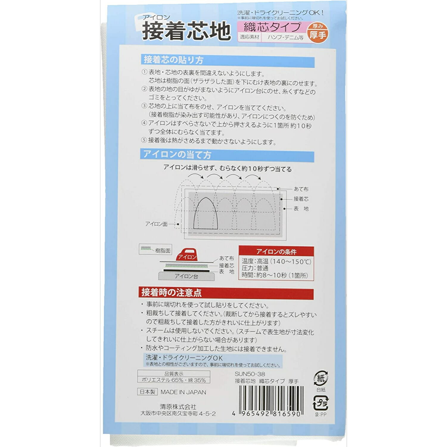 商品名接着芯地 織芯 厚手 白品番/色番SUN50-38生産国/原産国日本素材/成分ポリエステル65%・レーヨン35%規格内容量巾110cm×50cmパッケージサイズW130mm×H220mm使用上の注意洗濯の際、表地との相性がございます。