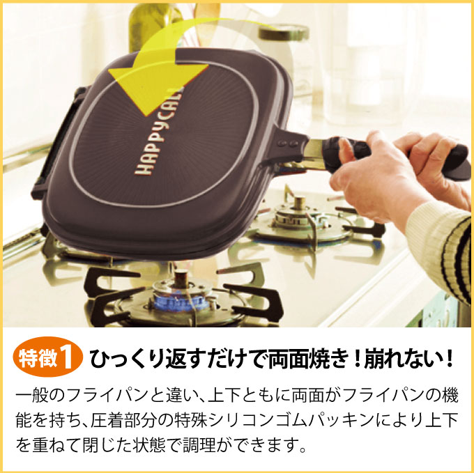 上下共にフライパンの機能を持った圧着部分の特殊シリコンにより、上下を重ねて閉じた状態で調理ができるすぐれモノ。