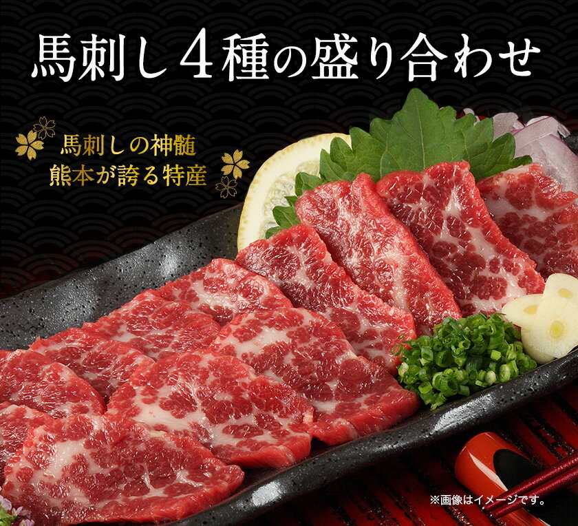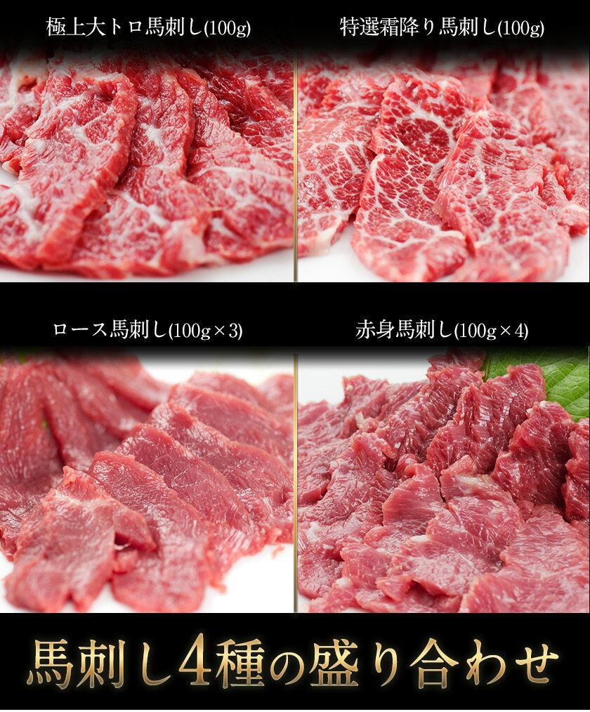 【ふるさと納税】★熊本特産馬刺し★馬刺し4種の盛り合わせ【極上大トロ馬刺し100g/特選霜降り馬刺し100g/ロース馬刺し100g×3/赤身馬刺し100g×4】+タレ360ml付き《30日以内に出荷(土日祝除く)》 熊本県 葦北郡 津奈木町